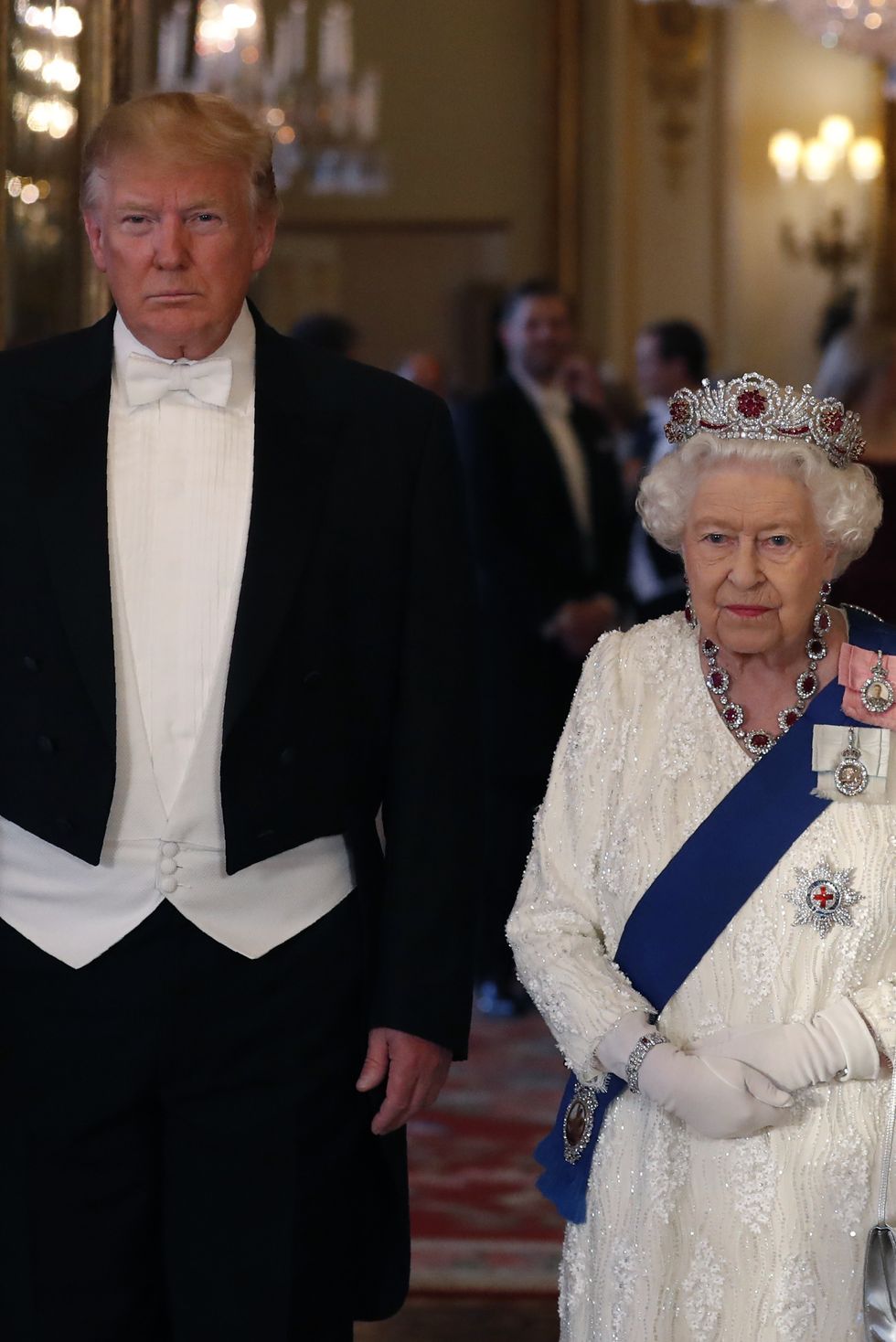 Gia đình hoàng gia không bao giờ được đưa ra quan điểm cá nhân về chính trị. Nhưng trong lần gặp gỡ tổng thống Trump, nhiều người nghĩ rằng nữ hoàng đã đưa ra ẩn ý về việc bất đồng chính kiến. Thợ kim hoàn chăm sóc chiếc vương miện cho biết 96 viên hồng ngọc đính trên đó được tạo ra bởi House of Garrard. Nó được tặng cho nữ hoàng như một món quà cưới từ người dân Miến Điện, mang ý nghĩa bảo vệ chống lại bệnh tật và tội ác.
