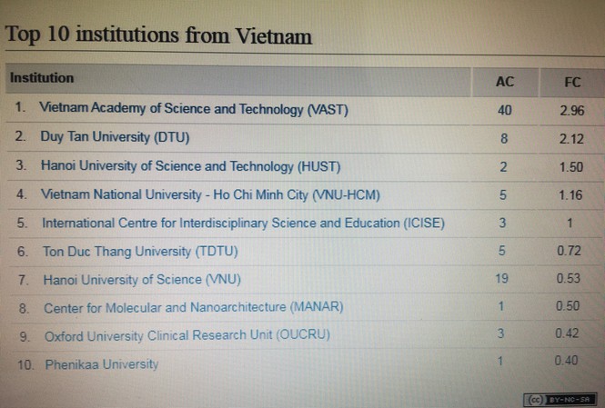 Các lĩnh vực công bố gồm: Khoa học trái đất và môi trường, khoa học vật lý, hóa học, khoa học đời sống. 10 cơ sở có tên trong Bảng xếp hạng này gồm: Viện Hàn lâm Khoa học và Công nghệ Việt Nam xếp vị trí thứ nhất của Việt Nam; Tiếp đến là các trường như ĐH Duy Tân, ĐH Bách khoa Hà Nội, ĐH Quốc gia Thành phố Hồ Chí Minh, Trung tâm quốc tế Khoa học và giáo dục liên ngành, ĐH Tôn Đức Thắng, ĐH Quốc gia Hà Nội; Trung tâm nghiên cứu lâm sàng Đại học Oxford (tại Việt Nam); Trung tâm Nghiên cứu Vật liệu cấu trúc Nano và phân tử (thuộc ĐH Quốc gia TP Hồ Chí Minh) và ĐH Phenika.