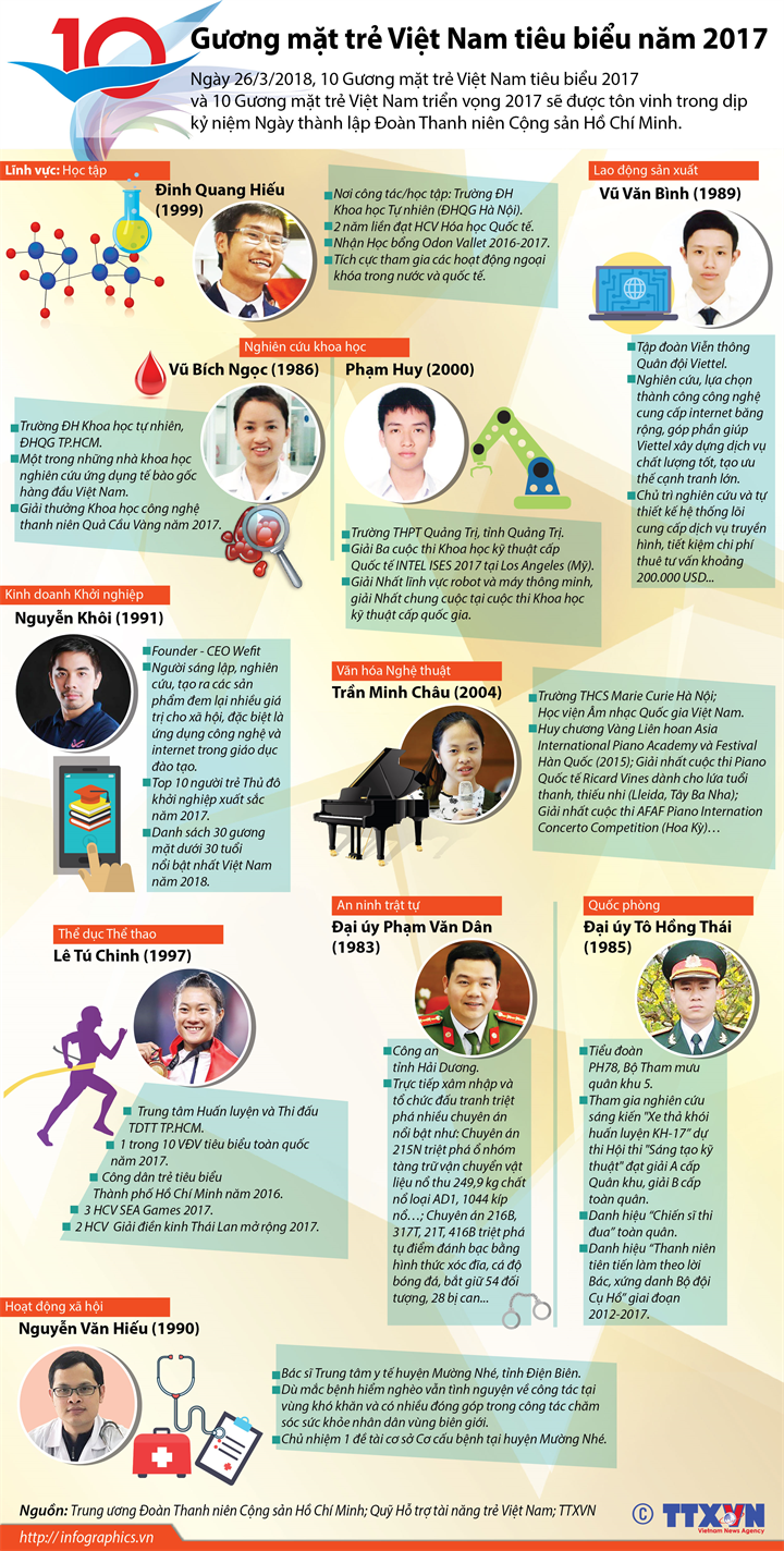 Tối 25/3 diễn ra sự kiện vinh danh 10 gương mặt trẻ tiêu biểu năm 2017 tại trường quay S14, Đài Truyền hình Việt Nam (Hà Nội). Đây là sự kiện thường niên do T.Ư Đoàn TNCS Hồ Chí Minh, Quỹ Hỗ trợ Tài năng trẻ Việt Nam tổ chức và được coi là giải thưởng uy tín. Mỗi tấm gương được vinh danh đều có nhiều thành tích đáng tự hào và luôn mong ước được cống hiến hết mình cho tổ quốc.