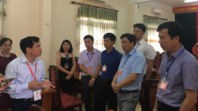 Ông Mai Văn Trinh (hàng đầu, bìa trái) đang trao đổi với hội đồng chấm thi Sở GD-ĐT Bắc Kạn. Ảnh: báo Thanh Niên.