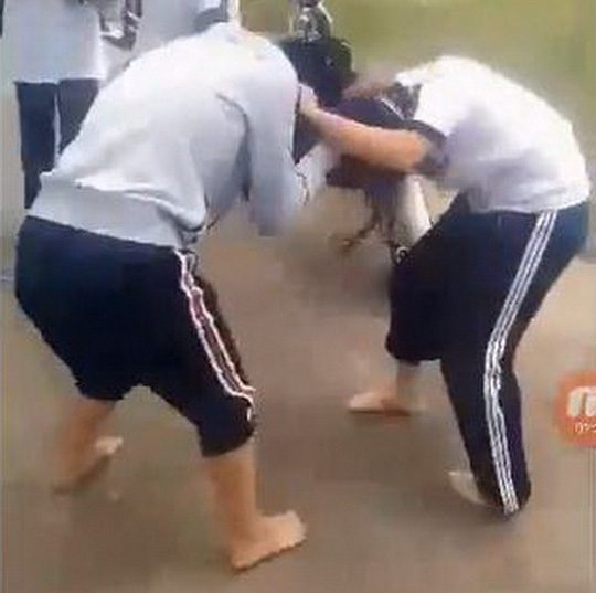 Xung quanh có nhiều học sinh chứng kiến nhưng các em này chỉ cổ vũ và quay clip lại. Ảnh cắt từ clip.