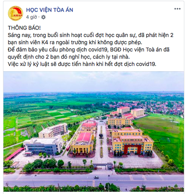 Do đó, để đảm bảo an toàn, Ban Giám đốc Học viện Tòa án đã quyết định cho hai người này nghỉ học, cách ly tại nhà. Việc xử lý kỷ luật với hai sinh viên này sẽ được học viện tiến hành khi hết đợt dịch COVID-19.