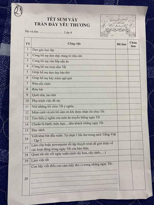 Theo đó, thay vì ra những yêu cầu như giải bài tập abc, tính phép toán xyz,… thì cô giáo này lại thiết thực hơn, yêu cầu học sinh của mình phải thực hiện những công việc như: Dọn góc học tập; Cùng bố mẹ dọn dẹp, trang trí nhà cửa; Cùng bố mẹ vào bếp nấu ăn; Cùng bố mẹ sắm Tết, giúp bố mẹ lau dọn bàn thờ; Rửa bát; Rửa cốc chén; Tìm hiểu ý nghĩa của món ăn truyền thống ngày Tết; Chuẩn bị bánh kẹo đón khách ngày Tết; Đọc sách…
