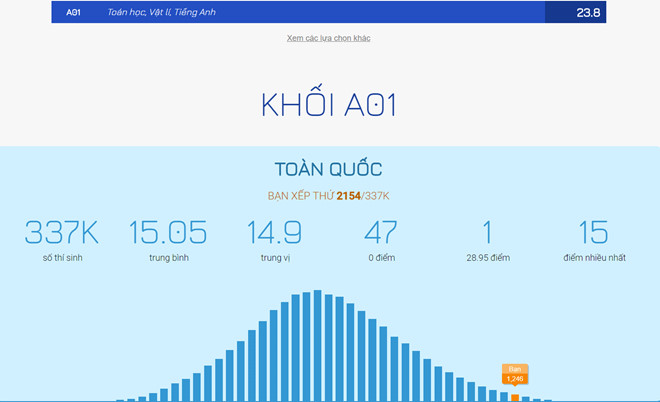 Đối với khối A01, Minh Anh hiện xếp thứ 2.154 trên 337.000 thí sinh có điểm thi ở tổ hợp này trên phạm vi toàn quốc.