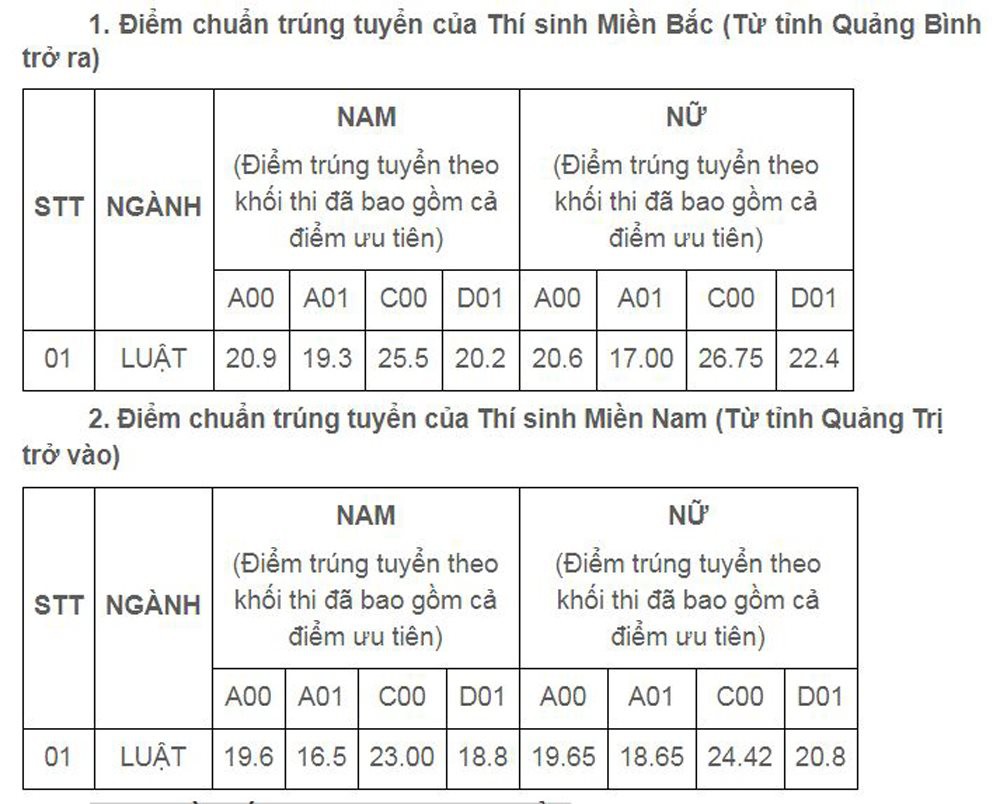 Điểm chuẩn cao nhất của Thí sinh Miền Bắc là 26,75 điểm tổ hợp C00 dành cho nữ; thấp nhất là 17 điểm tổ hợp A01 dành cho nữ.