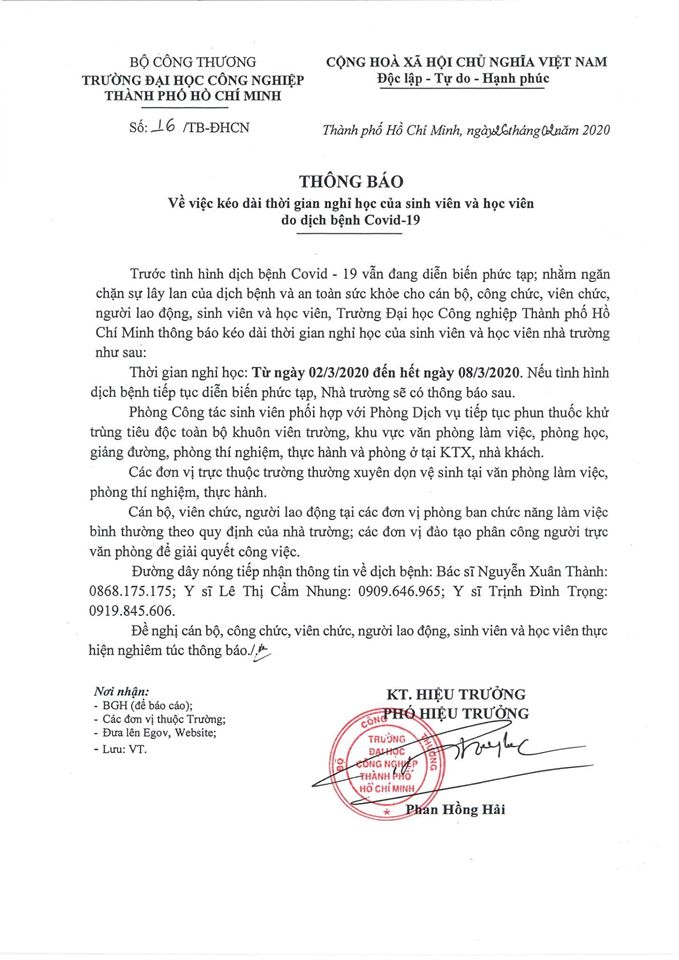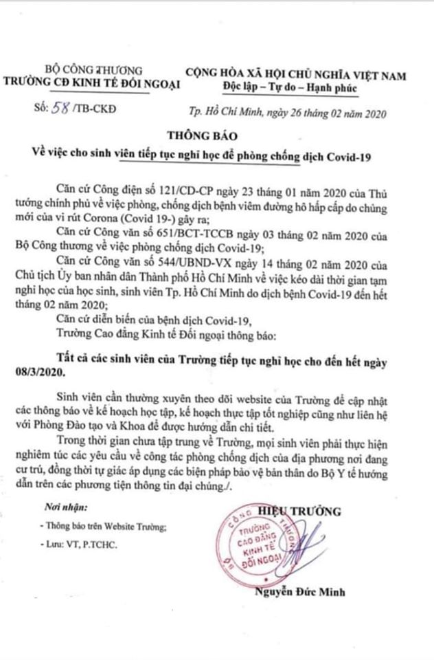 Theo đó trong ngày 26/2 các trường: ĐH Công nghiệp TP.HCM, ĐH Ngân hàng và Cao đẳng Kinh tế đối ngoại đã ra thông báo về việc tiếp tục cho sinh viên nghỉ học để phòng chống virus Corona.