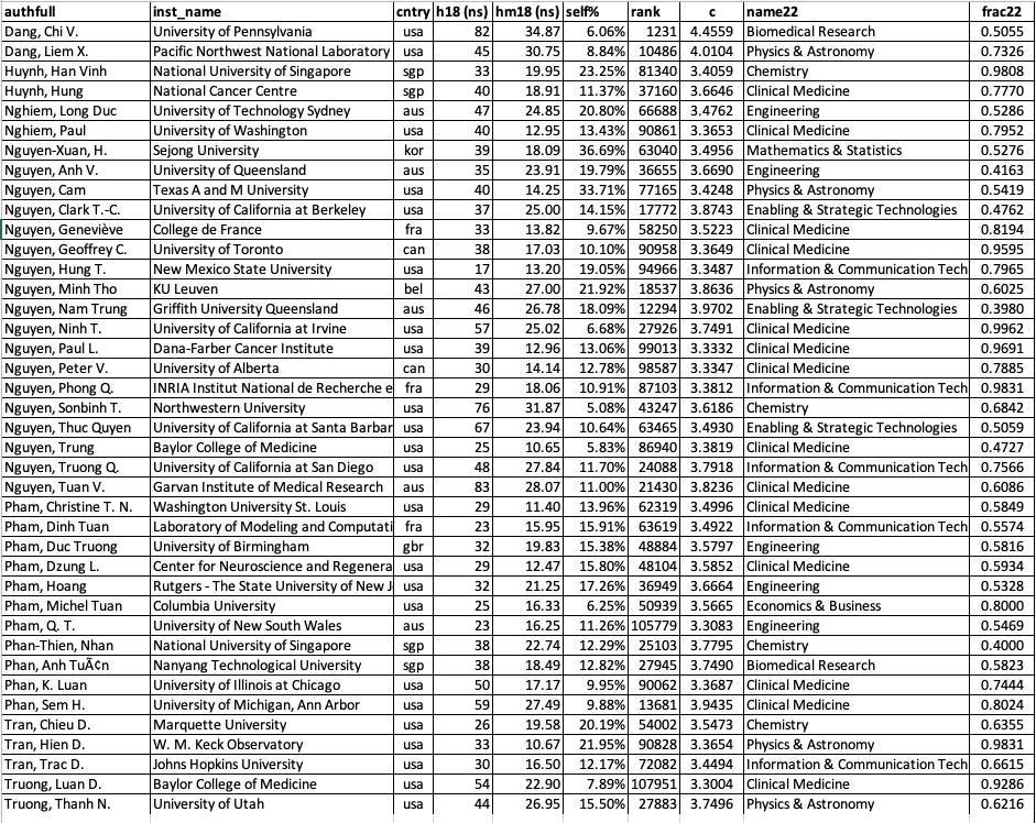 Về xếp hạng thế giới, trong số những nhà khoa học gốc Việt, Dang, Chi V có thứ hạng cao nhất ( 1.203 thế giới), tiếp đến là Phan, Sem H. của ĐH Michigan (11.932 thế giới) GS Nguyen, Nam-Trungcủa ĐH Griffith (Úc) (14.233 thế giới)