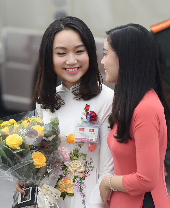 Phạm Thu Trà, (khi đó 19 tuổi), đại diện cho sinh viên Việt Nam tặng hoa ông Tập Cận Bình tại sân bay Nội Bài, Hà Nội, trưa 12/11/2017.