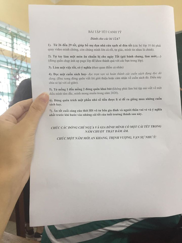 Quyết không để học trò của mình phải mệt mỏi, suy nghĩ quá nhiều về kiến thức chuyên môn trong kỳ nghỉ Tết, một giáo viên tại tỉnh Nam Định mới đây đã sáng tạo ra một dạng bài tập về nhà vô cùng độc đáo. Theo đó, bài tập có tất cả 7 “yêu cầu”, nguyên văn cụ thể như sau: