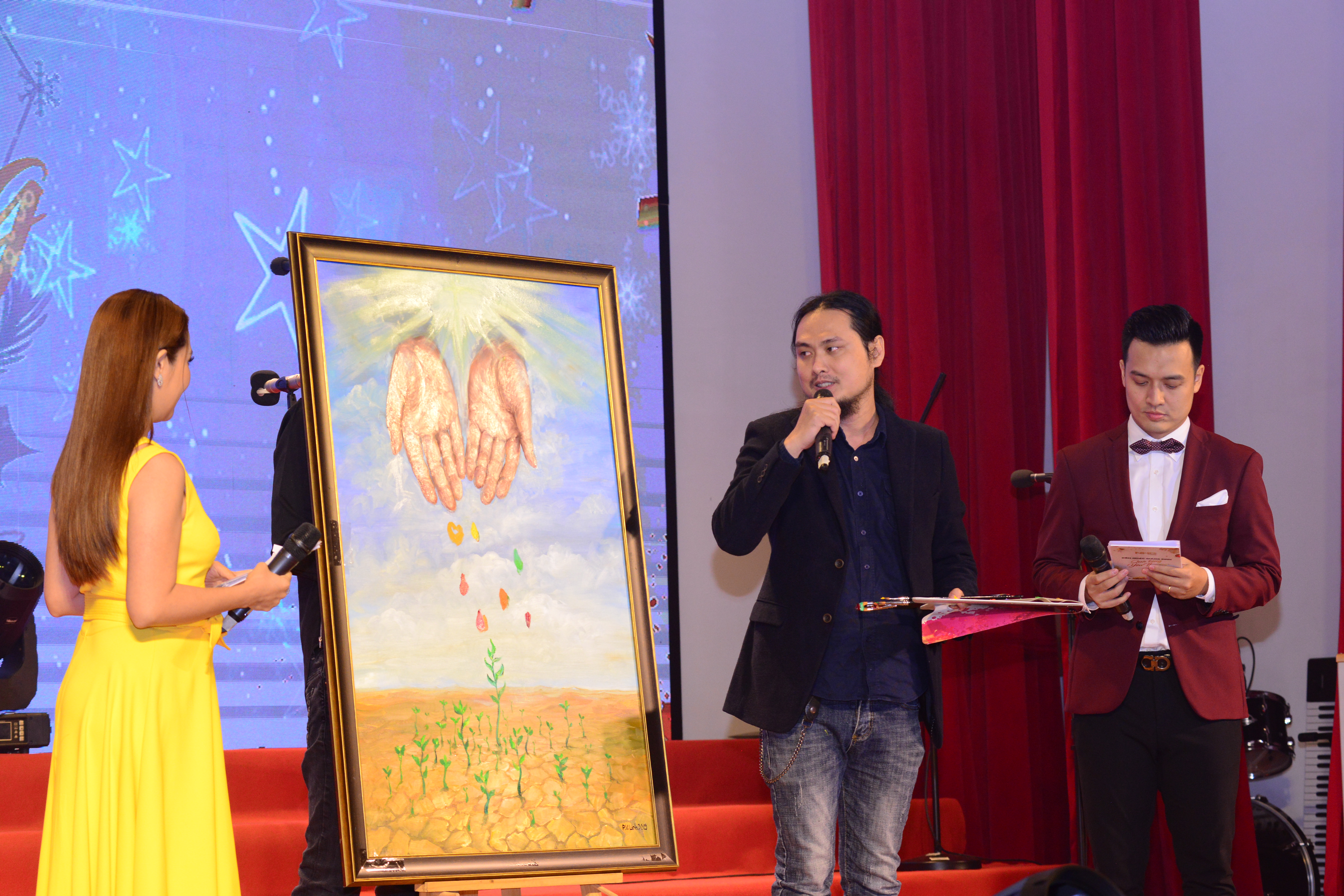Trong đó, bức tranh “Người gieo mầm tri thức” của họa sĩ Phan Vũ Linh, giảng viên Trường Đại học Hoa Sen được sáng tác đặc biệt bằng nghệ thuật vẽ tranh đảo ngược, lấy ý tưởng từ người gieo hạt trong Kinh thánh và người gieo hạt này cũng là hình ảnh người thầy - gieo hạt giống tâm hồn cho thế hệ trẻ. Á hậu quý bà thế giới, Hoa Khôi thể thao Nguyễn Thu Hương - Tổng giám đốc tập đoàn đầu tư & truyền thông Nam Hương đã đấu giá thành công bức tranh với giá trị 160 triệu đồng.