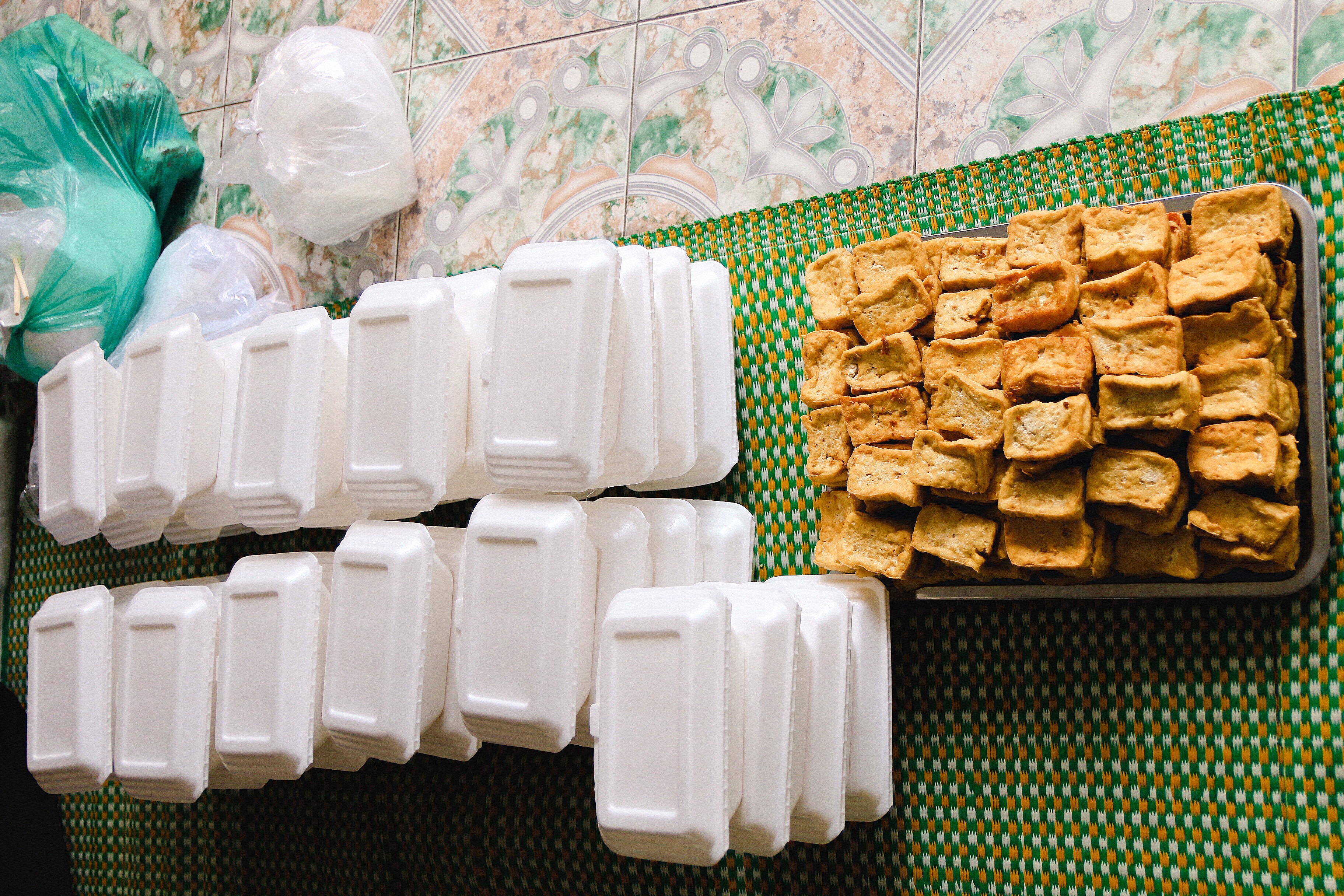 Các suất cơm hộp sẵn sàng được mang đi tặng cho người nghèo.