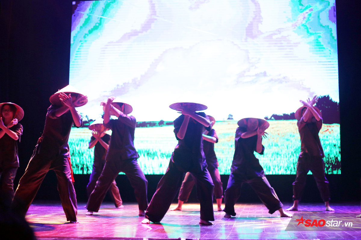 Các thành viên nhóm võ thuật HAMAC hóa thân thành những người nông dân Việt, truyền tải câu chuyện về cuộc chiến giữa cái thiện và cái ác với ngôn ngữ vũ đạo.