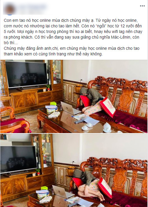 Theo đó, anh chàng này hậm hực viết: “Con em gái mình học online mùa dịch mọi người ạ. Từ ngày nó học online, cơm nước nó nhường lại cho mình làm hết. Nó ngồi học từ 12 rưỡi đến 5 rưỡi. Mọi ngày nó học trong phòng thì không ai biết nhưng nay nó kêu wifi lag nên chạy ra phòng khách. Cô thì vẫn đang say sưa giảng chủ nghĩa Mác-Lênin, còn trò thì…”.