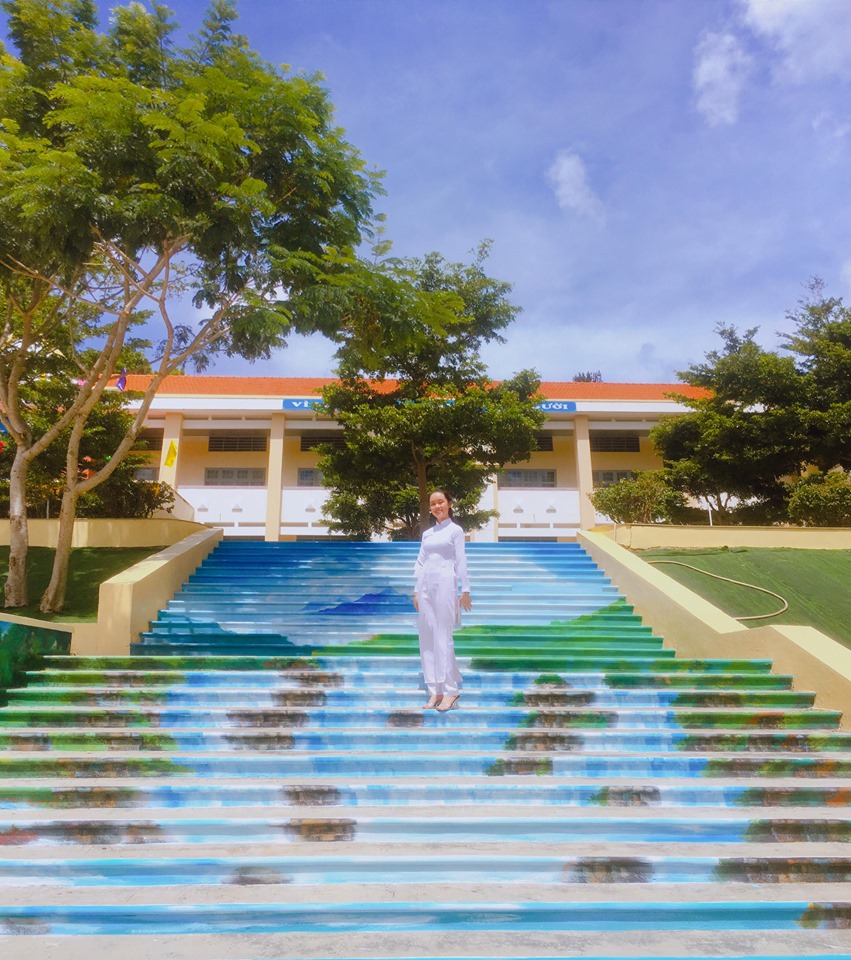 Không chỉ dừng lại với các bậc thang “7 sắc cầu vồng”, mới đây, lãnh đạo nhà trường đã quyết định “trang trí” thêm những bậc thang còn lại trong khuôn viên của trường theo họa tiết của các bức tranh phong cảnh vô cùng độc đáo.