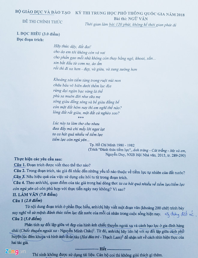 Đề thi Ngữ văn THPT quốc gia 2018.