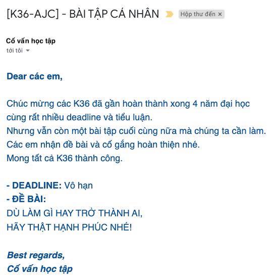 Cụ thể một hình ảnh chụp màn hình email về đề bài này đến từ cố vấn học tập của một trường đại học mới đây đã khiến cộng đồng mạng không khỏi bất ngờ. Nguyên văn nội dung của bài tập về nhà này cụ thể như sau: