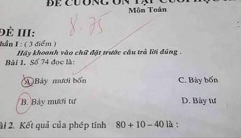 Tiếp sau bài toán đếm hình tam giác gây bão mạng, cư dân mạng lại tiếp tục “đào mộ” bài toán đọc số của lớp 1, bài toán một thời khiến các “anh tài” phải đau đầu, nhức óc. Cụ thể, trong một đề cương ôn tập học kỳ của học sinh lớp 1 có một câu hỏi như sau: “Hãy khoanh vào chữ đặt trước câu trả lời đúng. Số 74 đọc là:…” Đi kèm câu hỏi là 4 đáp án khác nhau.