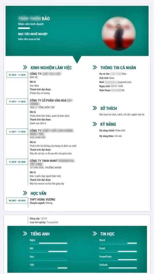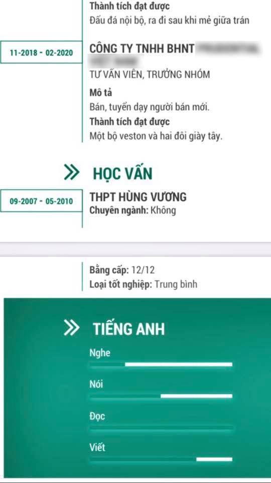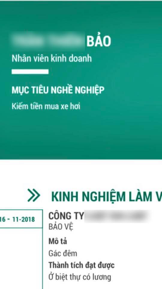 “Công việc đầu đời: Làm bảo vệ. Bạn có tin rằng với CV này của thằng em mình, nó được tuyển dụng không? Mới đầu nó làm kiểu chính chuyên lắm, đọc vô thấy khá là bài bản lắm, mà đợi hoài không ai gọi, chắc do một màu quá không có gì đặc biệt. Cái nó sửa đi sửa lại, ghi kiểu đúng bản chất của nó luôn, ngắn gọn thế này thôi mà có người hốt.”