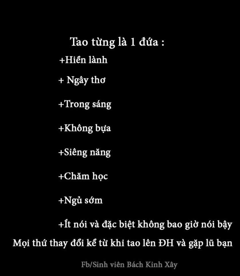 Câu trả lời được nằm gói gọn ở đây: “Mình từng là 1 đứa hiền lành, ngây thơ, trong sáng, không bựa, siêng năng, chăm học, ngủ sớm, ít nói và đặc biệt không bao giờ nói bậy. Mọi thứ thay đổi kể từ khi tao lên đại học và gặp lũ bạn”.