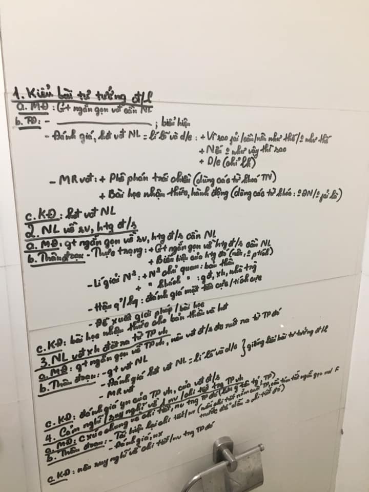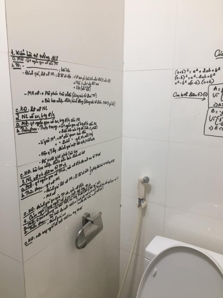 Cụ thể, một bạn học sinh đã nảy ra ý tưởng ôn lại bài ngay trong… nhà vệ sinh. Bạn học sinh này không chỉ học 1 môn mà còn học hẳn 2 môn Văn và Toán bằng cách dùng bút lông ghi lại công thức Toán học và dàn ý bài Văn trên tường nhà vệ sinh.