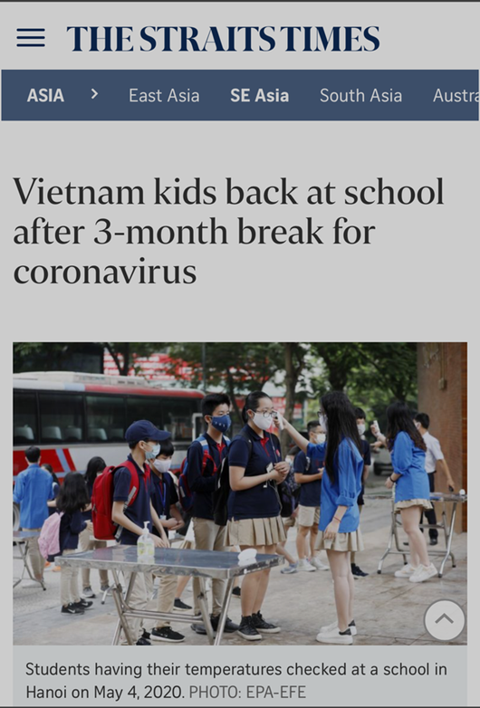Báo Singapore đưa tin về việc học sinh Việt Nam trở lại trường vào ngày 4/5.