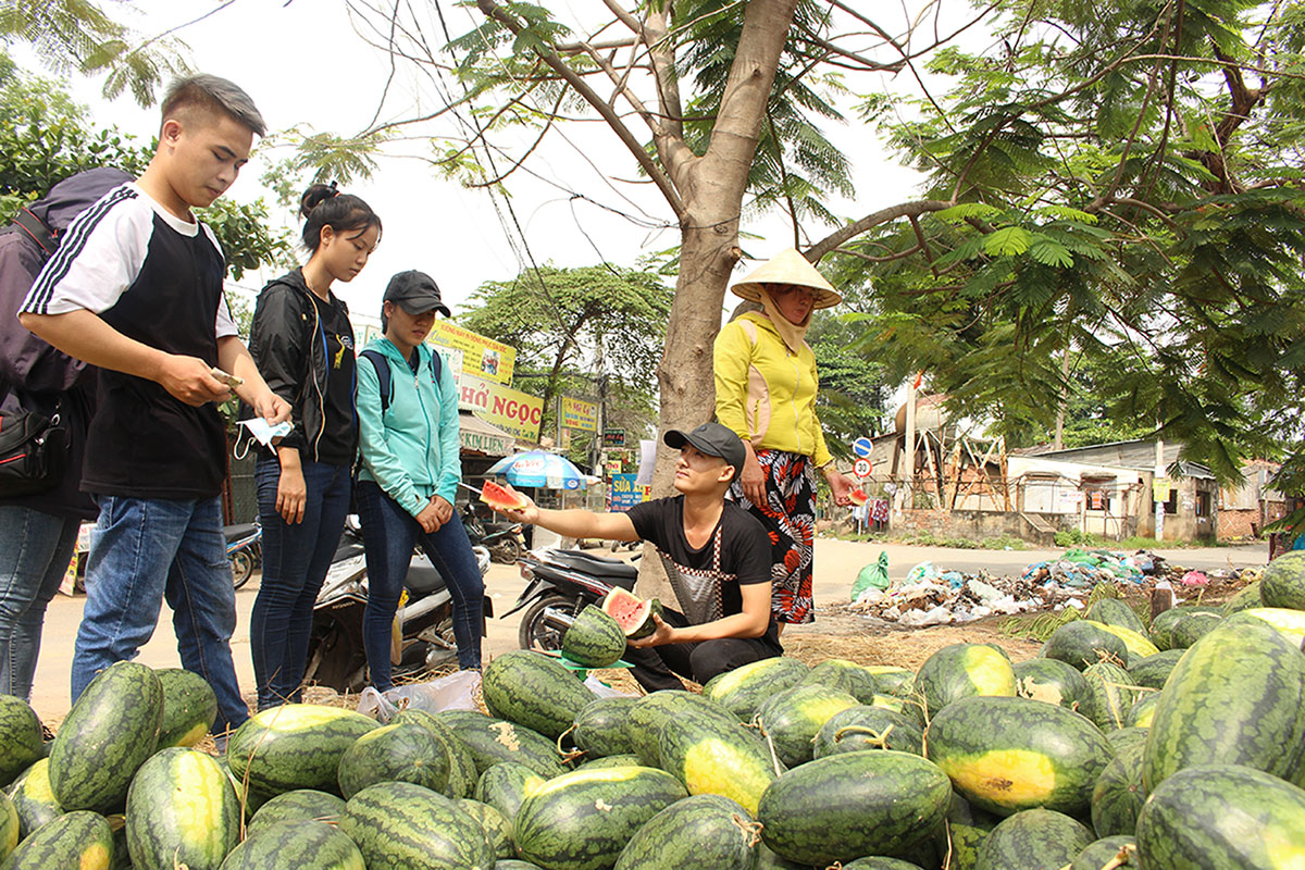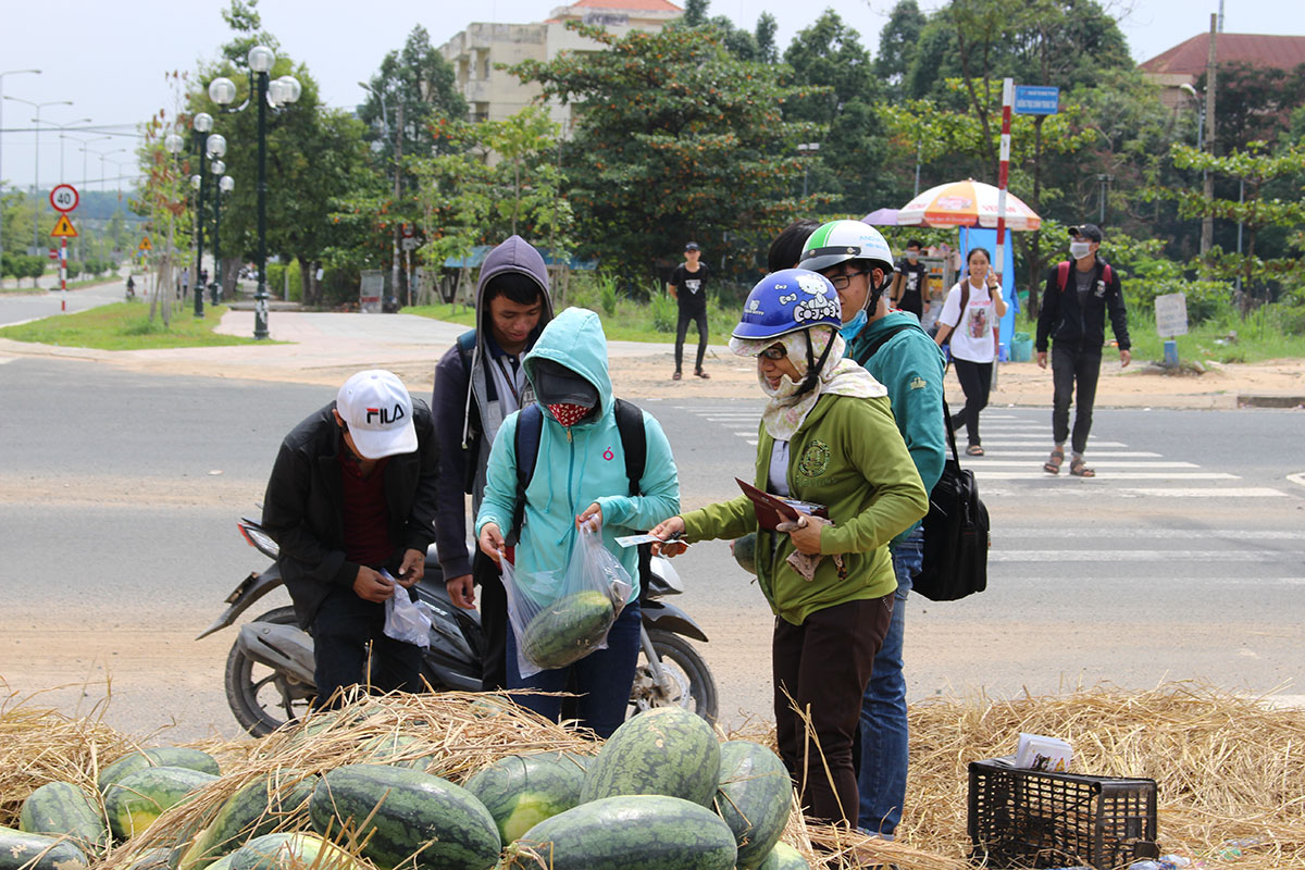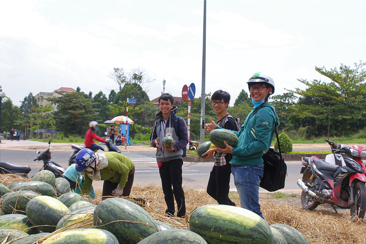 Các bạn sinh viên hào hứng mua dưa ủng hộ người dân Quảng Ngãi.
