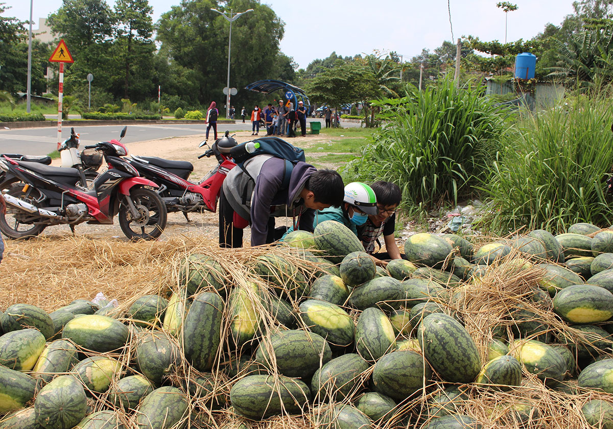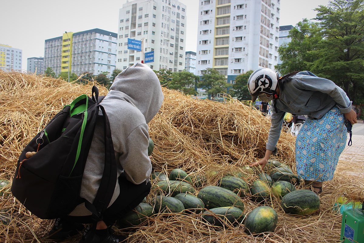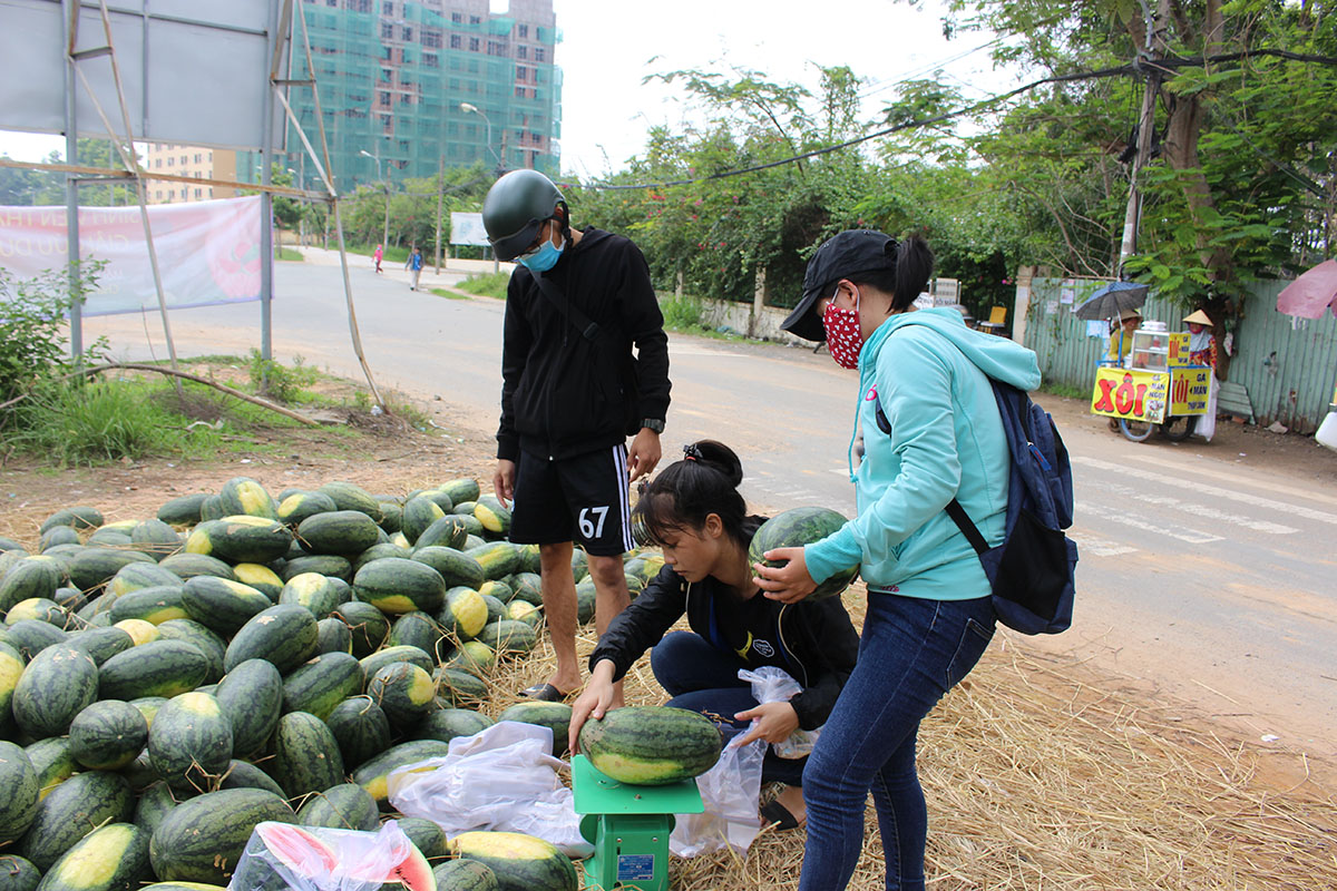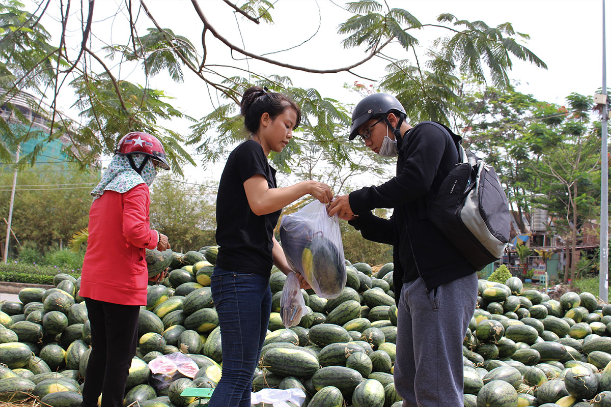 Với tinh thần tương thân tương ái, sau khi biết được thông tin một số xe dưa của người dân Quảng Ngãi được đưa vào Sài Gòn để bán, các bạn sinh viên đã tình nguyện tới từng địa điểm xin được giúp sức, hỗ trợ bà con.