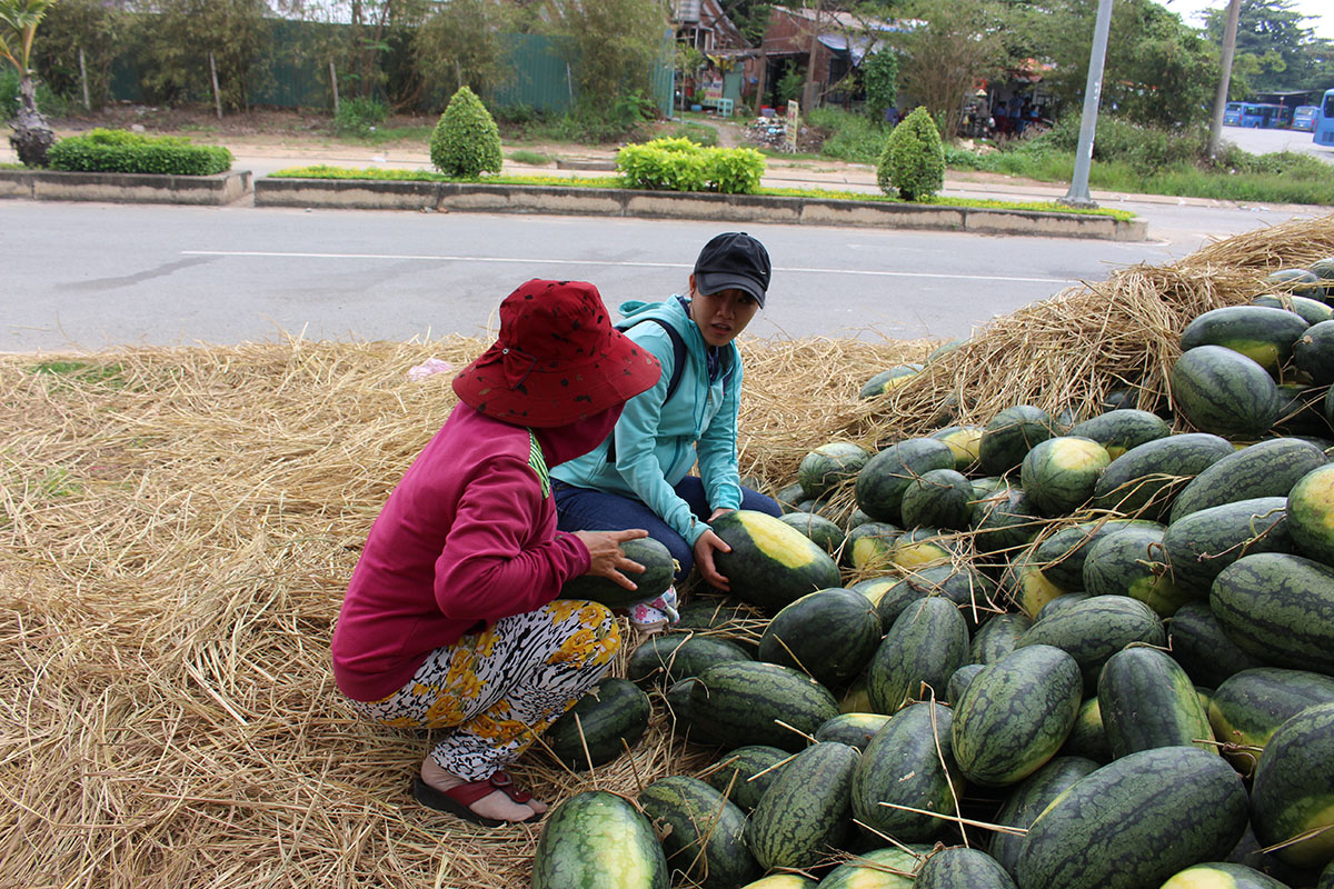 Nhóm bạn tỏ ra vui vẻ khi vừa mua được những trái dưa ưng ý, vừa giúp được người dân Quảng Ngãi