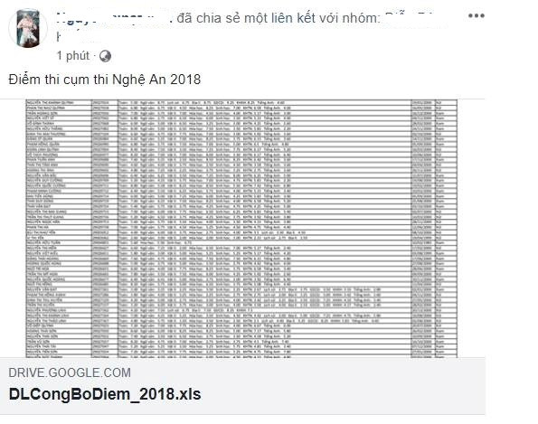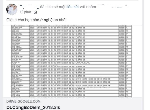 Tệp thông tin được cho là điểm thi THPT quốc gia 2018 của tỉnh Nghệ An xuất hiện trên mạng xã hội trước 1 ngày công bố điểm do Bộ GD&ĐT quy định. Ảnh chụp màn hình.