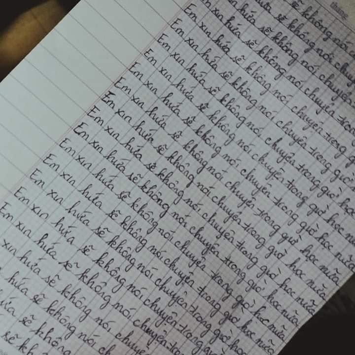 Mới đây, diễn đàn Trường Người Ta đã cho đăng tải một hình ảnh khiến cho nhiều bạn trẻ gợi nhớ được phần nào tuổi thanh xuân của chính mình ở trong đó, đó chính là tờ giấy chép phạt. Với chỉ một câu “Em xin hứa sẽ không nói chuyện trong giờ học nữa”, bạn học sinh này không biết đã phải chép đi chép lại biết bao nhiêu lần.