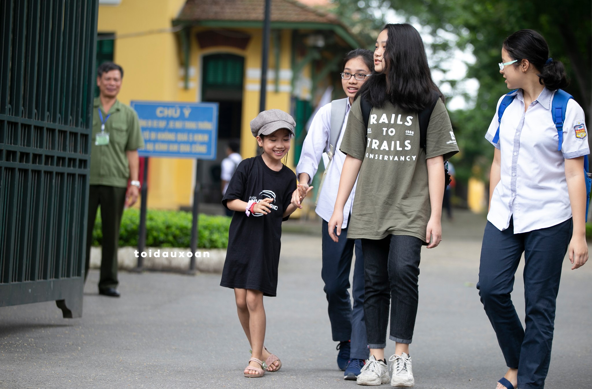 Khi thấy chị gái bước ra gần đến cổng, bé gái mừng rỡ gọi tên, nhảy cẫng lên vì sau hàng giờ chờ đợi cuối cùng cũng được gặp chị gái thân yêu của mình.