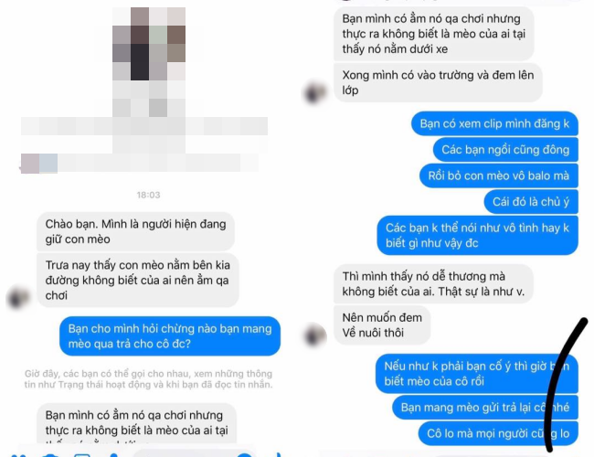 “Thì mình thấy nó dễ thương nên muốn mang về nuôi thôi”, nam sinh nhắn tin, sau đó thì lại tiếp tục thanh minh, “Không phải mình chứ nếu gặp người khác còn lâu mới trả, con mèo đi lang thang không có dây đeo không bảng tên. Thiệt sự mình đam về là tính đăng lên Hội yêu mèo tìm chủ cho nó rồi”.