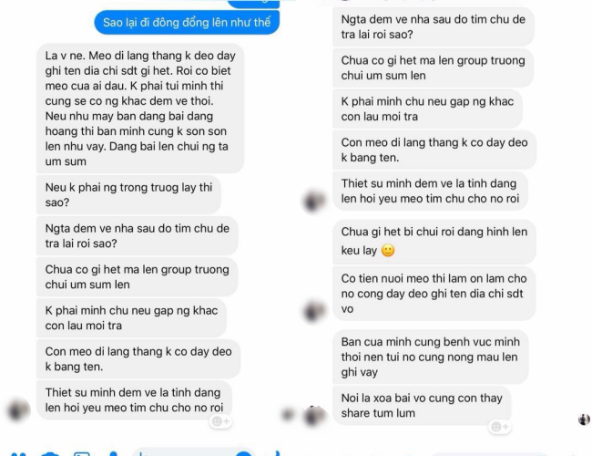 Thậm chí, nam sinh này còn lên tiếng trách móc cho rằng do chủ của chú mèo không gắn biển tên, ghi số điện thoại lên cổ chú mèo nên chẳng biết là của ai. “Có tiền nuôi mèo thì làm ơn cho nó cọng dây đeo ghi tên, địa chỉ, số điện thoại vô”.