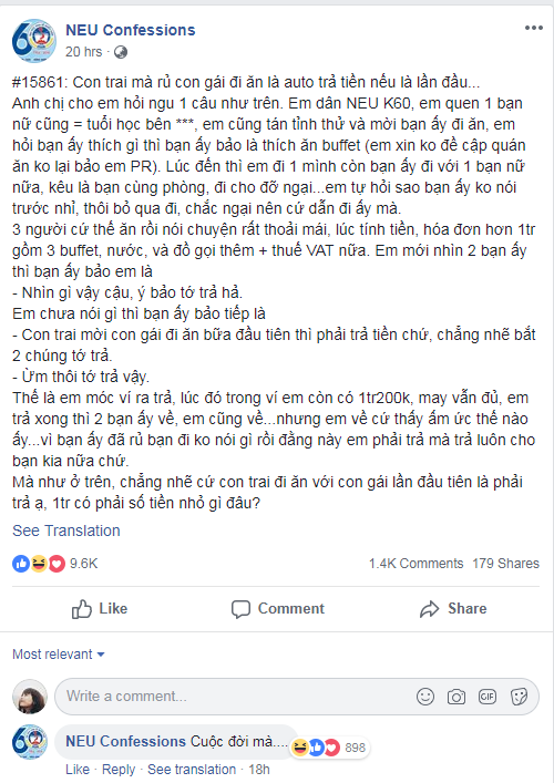 Bài viết với câu hỏi “có phải cứ đi ăn lần đầu là con trai auto phải trả tiền” gây sốt của nam sinh NEU.