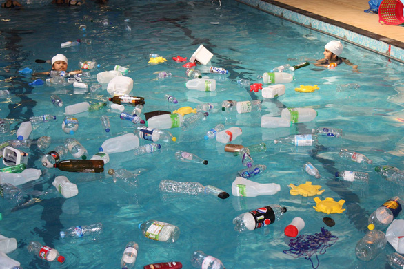 Trẻ bơi trong hồ “ô nhiễm” rác nhựa để hiểu về nguy cơ của loại rác khủng khiếp này với cuộc sống - Ảnh: POLAM SCHOOL