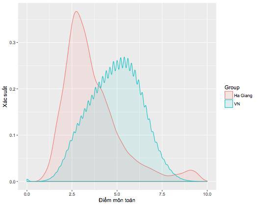 Biểu đồ này cho thấy phân bố điểm của Hà Giang (màu hồng) và của cả nước (màu xanh). Có hai điểm chính có thể rút ra từ hình này: (a) Điểm trung vị của Hà Giang là khoảng 3.2, thấp hơn điểm của toàn quốc (trung vị khoảng 5.0); (b) Phân bố điểm của Hà Giang có vẻ bất thường ở điểm từ 8 đến 10. Chú ý đường biểu diễn của Hà Giang “nhô lên” trong khi đáng lí ra phải smooth như cả nước.