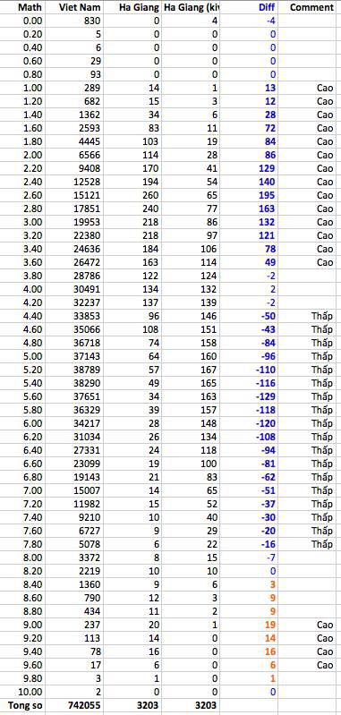 Để kiểm tra kĩ hơn chỗ “nhô lên” đó, cần phải phân tích so sánh giữa phân bố điểm thực tế của Hà Giang và điểm của cả nước.. Ví dụ, chú ý cột số 4 (Ha Giang), ở điểm 9, nếu theo phân bố quốc gia thì chúng ta kì vọng Hà Giang có 1 em đạt điểm này. Thế nhưng trong thực tế, Hà Giang có đến 20 em đạt điểm 9 (cột 3).