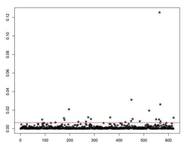 Đường màu đỏ là giá trị kỳ vọng (đáng lý là phải vậy). Chỉ cần 1 cá nhân là đã phải nghi ngờ, và ở đây là khoảng 20 em trên đường màu đỏ, vượt xa kỳ vọng có thể xem là bất bình thường, đặc biệt có một thí sinh “ngồi” riêng ở vị trí rất xa các bạn khác. Đây là những con số phải nghi ngờ ngay.