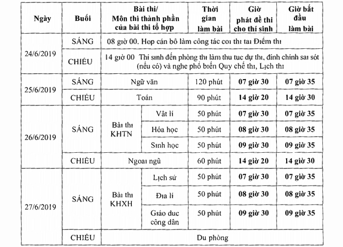 Sáng 25/6, các em thực hiện bài thi đầu tiên là Ngữ văn, chiều thi Toán. Ngày tiếp theo, thí sinh làm bài Khoa học tự nhiên vào buổi sáng và Ngoại ngữ vào buổi chiều. Trong ngày thi cuối cùng (27/6), thí sinh thi bài Khoa học xã hội.