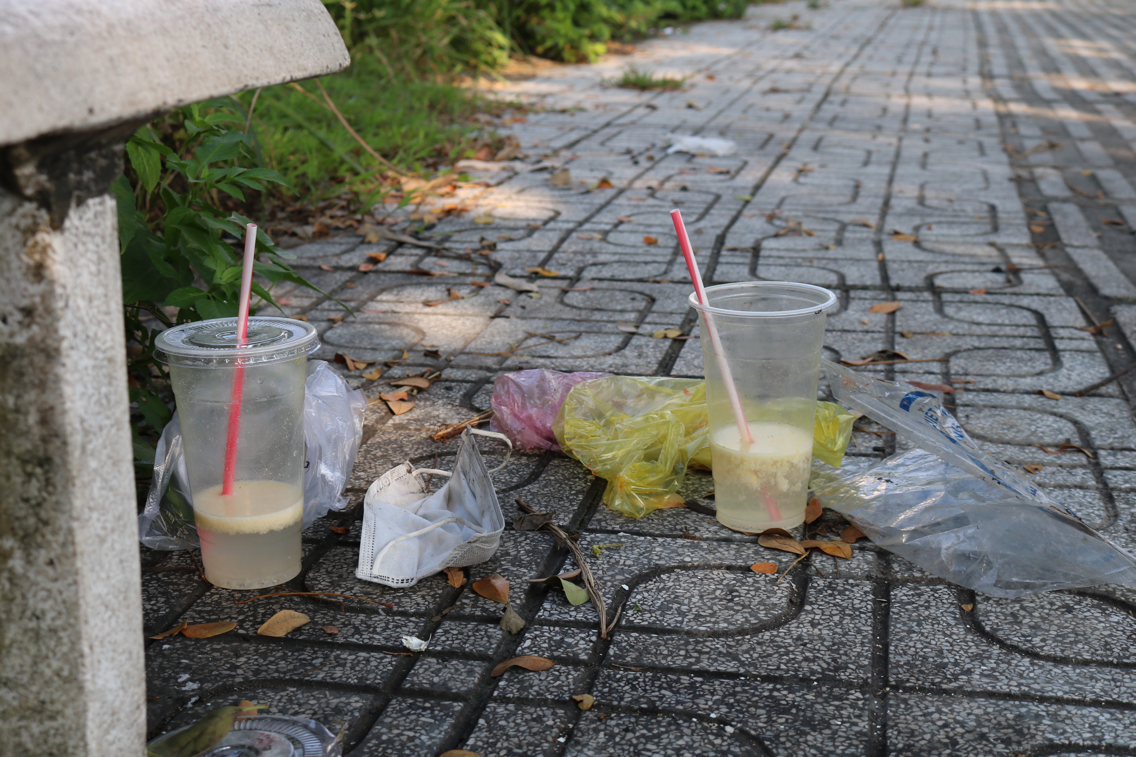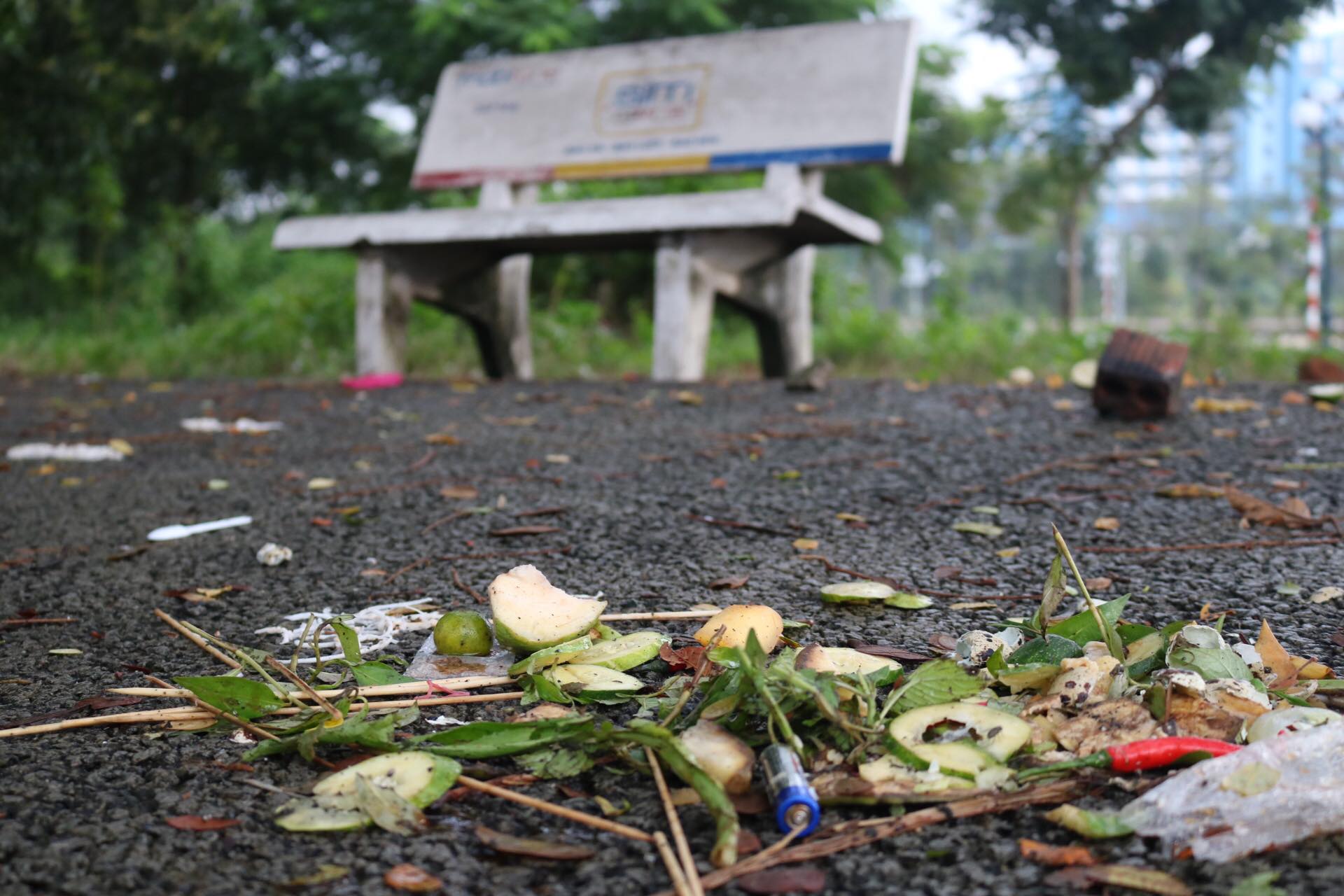 Rác chủ yếu gồm các chai, ly, nhựa (đồ sử dụng một lần) biến mất bằng cách cho “phù phép” sau ghế đá. ẢNH: HOÀNG AN