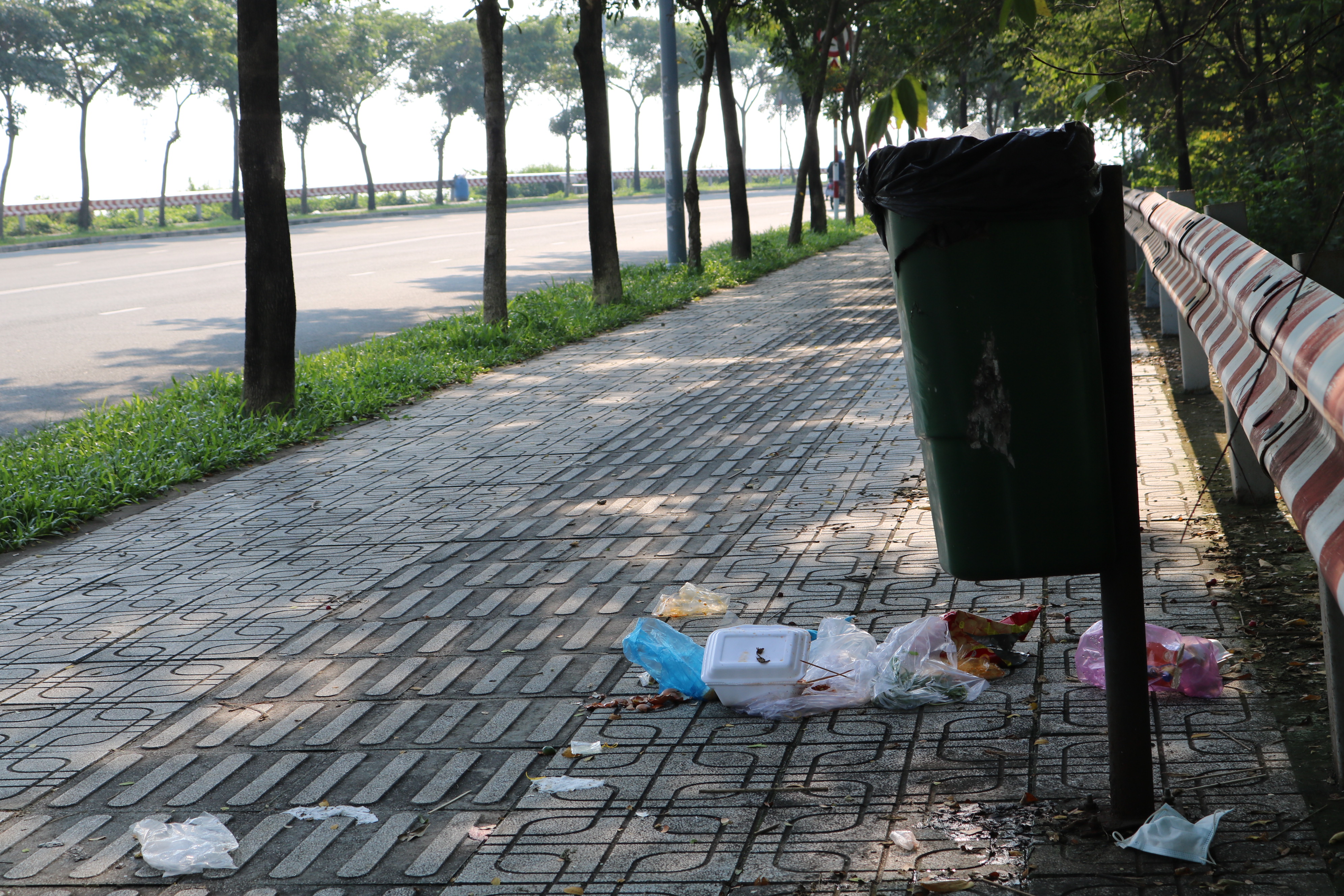 Dọc vỉa hè đặt ghế đá tuy đã được trang bị thùng rác nhưng rác vẫn nằm “chình ình” phía sau chỗ ngồi. ẢNH: HOÀNG AN