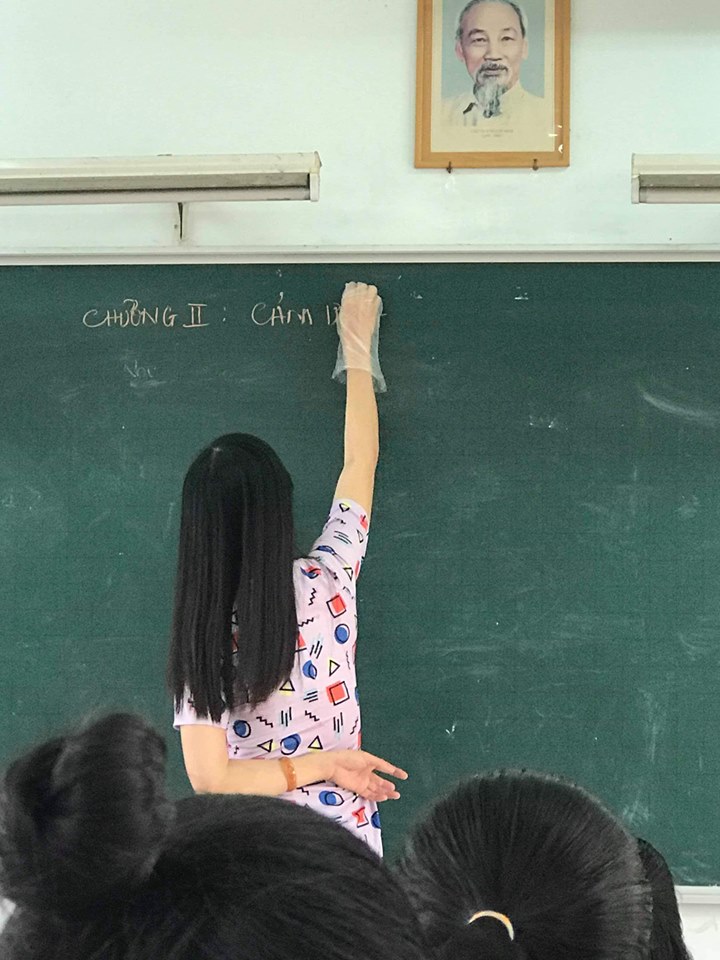 Thầy cô ai cũng quen với bụi phấn, bên tay phải thường hao mòn vì phấn trắng… Vậy nhưng ít ai lên lớp mà đeo thêm bao tay. Thế nên bức ảnh mới đây lan truyền trên mạng chụp lại khoảnh khắc đó lập tức nhận được sự chú ý của đông đảo mọi người.
