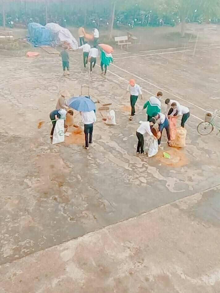 Các bạn học sinh cùng nhau chạy thóc tránh mưa giúp bác bảo vệ