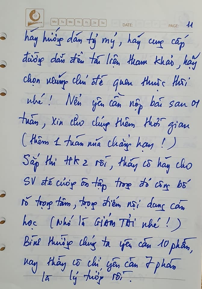 Tiếp nữa, chúng mình hãy giảm yêu cầu, đặc biệt trong kiểm tra đánh giá. Nếu giao sinh viên làm tiểu luận, bài tập lớn, xin thầy cô hãy hướng dẫn tỉ mỉ, cung cấp đường dẫn đến tài liệu tham khảo, chọn những chủ đề quen thuộc thôi nhé. Nếu yêu cầu nộp bài sau 1 tuần, xin cho chúng thêm thời gian (thêm 1 tuần nữa chẳng hạn).