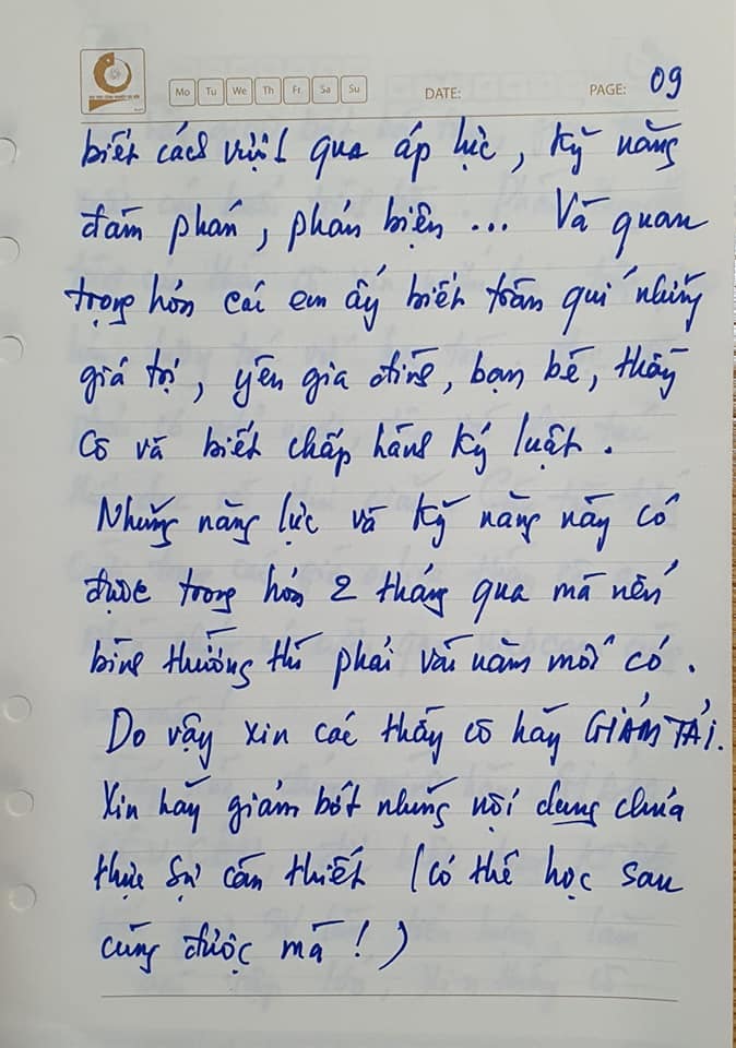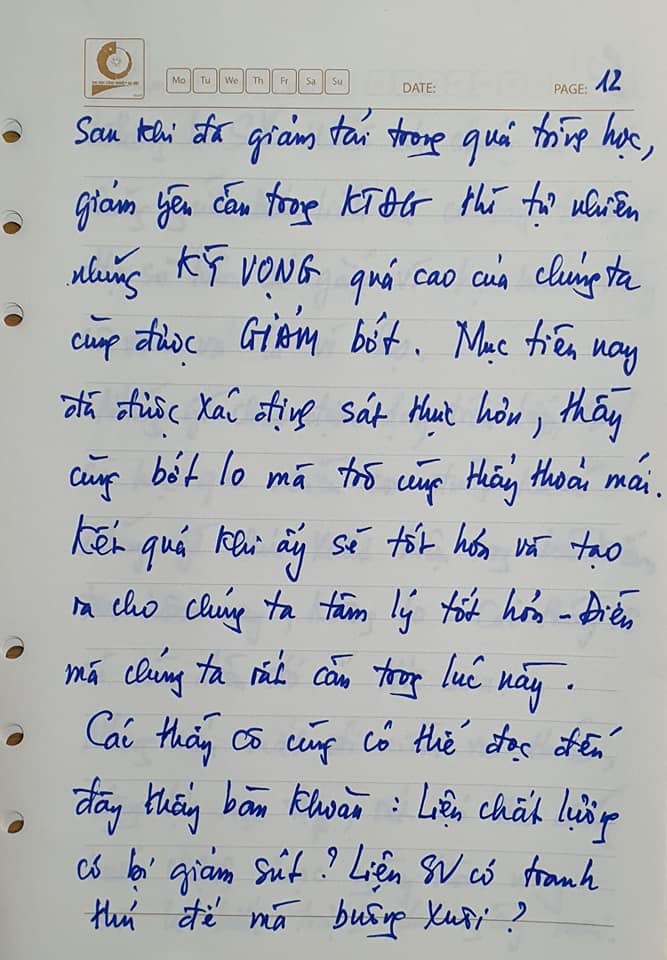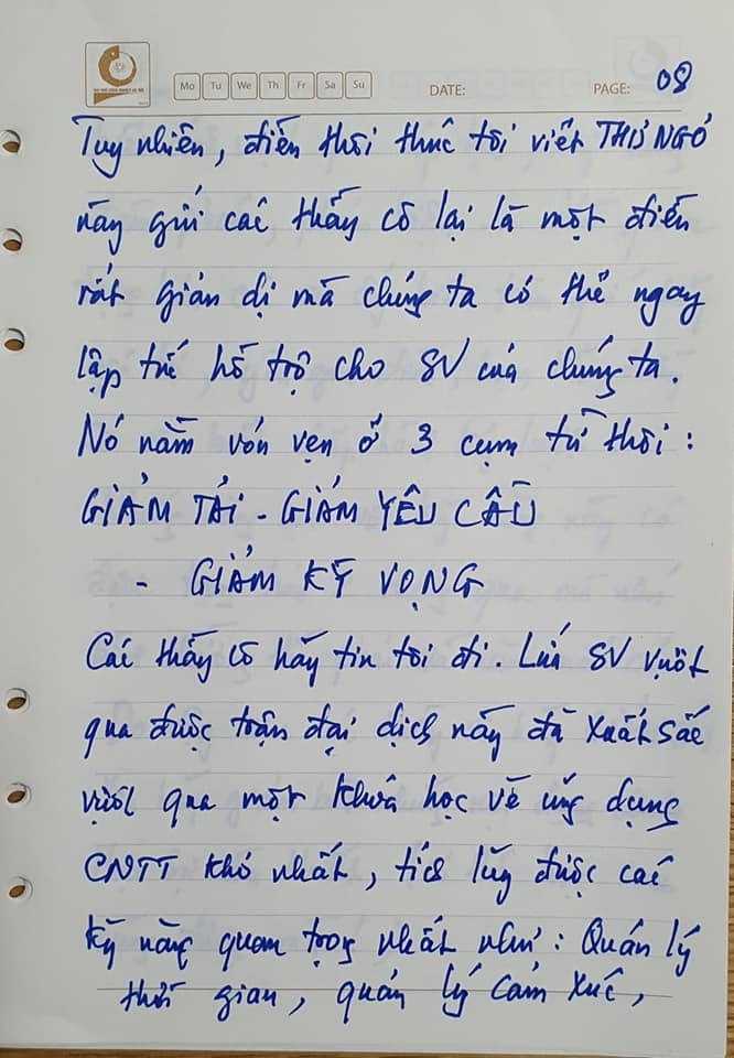 Tuy nhiên, điều thôi thúc tôi viết thư ngỏ này gửi các thầy cô lại rất giản dị mà chúng ta có thể ngay lập tức hỗ trợ cho sinh viên của mình. Nó nằm vỏn vẹn ở 3 cụm từ thôi: Giảm tải - giảm yêu cầu - giảm kỳ vọng.