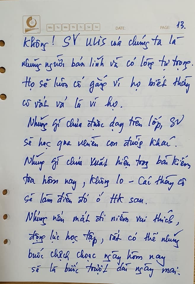 Các thầy cô đọc đến đây có thể cũng thấy băn khoăn: Liệu chất lượng có bị giảm sút? Liệu sinh viên có tranh thủ để buông xuôi? Không! Sinh viên ULIS của chúng ta là những người bản lĩnh và có lòng tự trọng. Họ sẽ luôn cố gắng vì họ biết thầy cô vất vả vì họ.