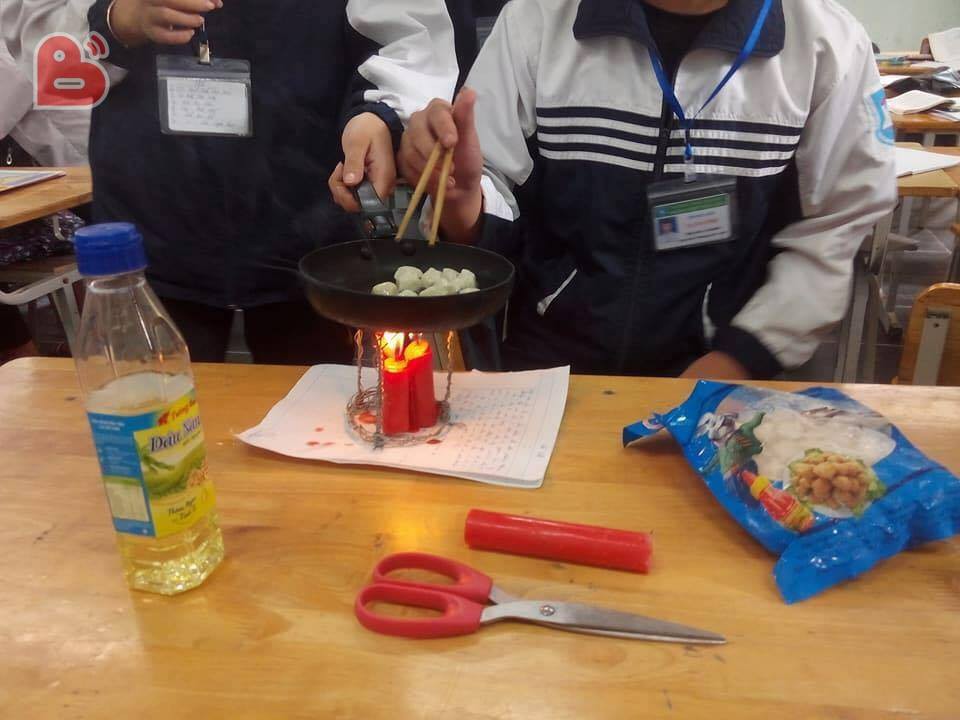 Trước đây, dân mạng đã lan truyền hai bức ảnh về một nhóm học sinh tổ chức ăn uống trong lớp học. Họ đã tự chế bếp lò bằng cách chụp 3 cây nến lớn đang cháy, rồi đặt chảo dầu nhỏ lên trên để chiên chả cá. Cách cứu đói sau những giờ học mệt mỏi này quả thực chỉ có học sinh mới nghĩ ra mà thôi.