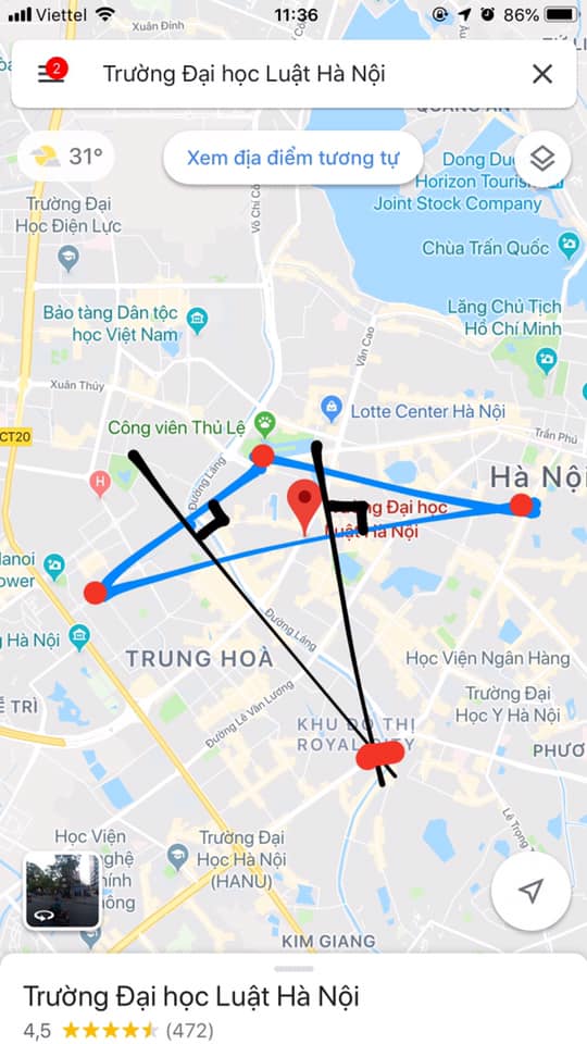 Mới đây, trên một diễn đàn mạng xã hội đã đăng tải bức hình bản đồ một góc Hà Nội, với dòng chú thích “Khi 3 người 3 nơi và không biết ăn ở đâu cho tiện nhất“. Theo đó, “khổ chủ” đánh dấu vị trí nhà của 3 người trong nhóm, vẽ hình tam giác và kẻ 3 đường trung trực (đoạn thẳng nối đỉnh và trung điểm cạnh đối diện). Ai từng học cũng biết 3 đường trung tuyến của một tam giác sẽ giao nhau tại 1 điểm, và đó chính là điểm tương đối gần với khu vực “trung tâm” của 3 người.