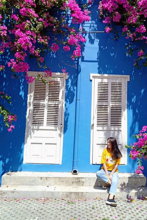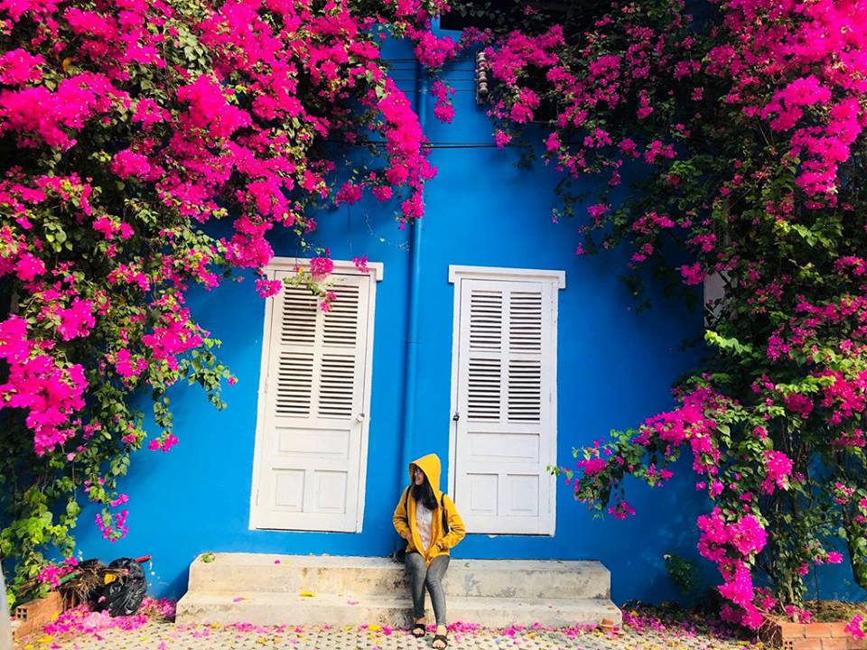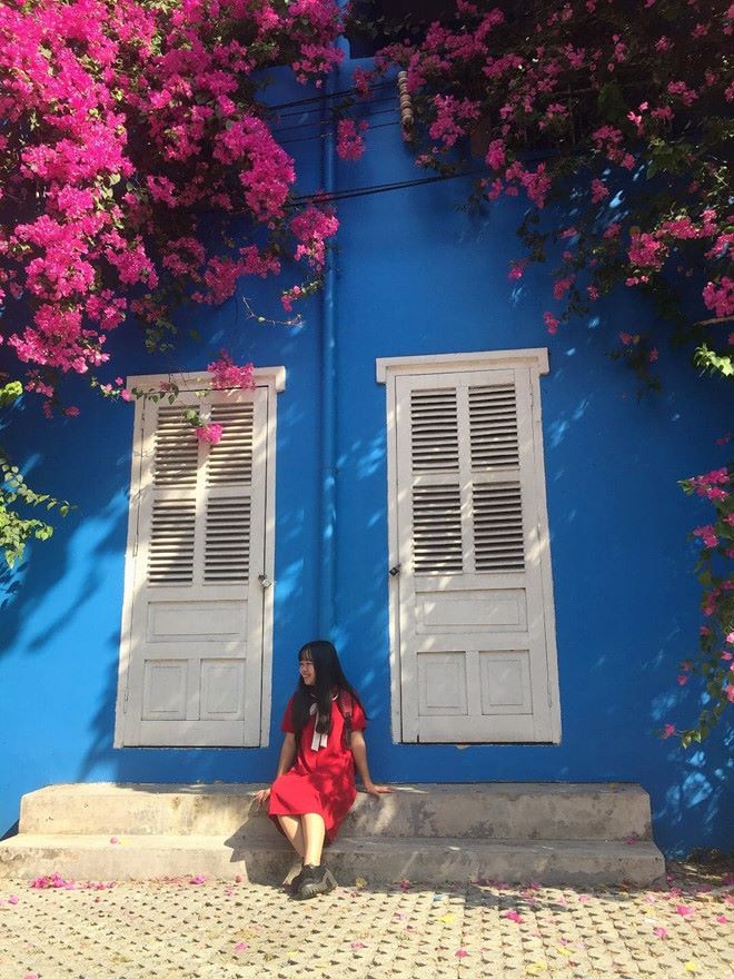 Bờ tường màu xanh làm được phủ kín bởi hoa giấy tạo nên khung cảnh lãng mạn. Ảnh: Bình Dương 24H
