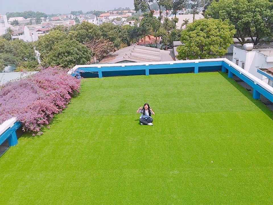 Thảm cỏ xanh mượt trên sân thượng dãy nhà Ngoại ngữ cũng là địa điểm ưa thích của các bạn sinh viên. Ảnh: Bình Dương 24H